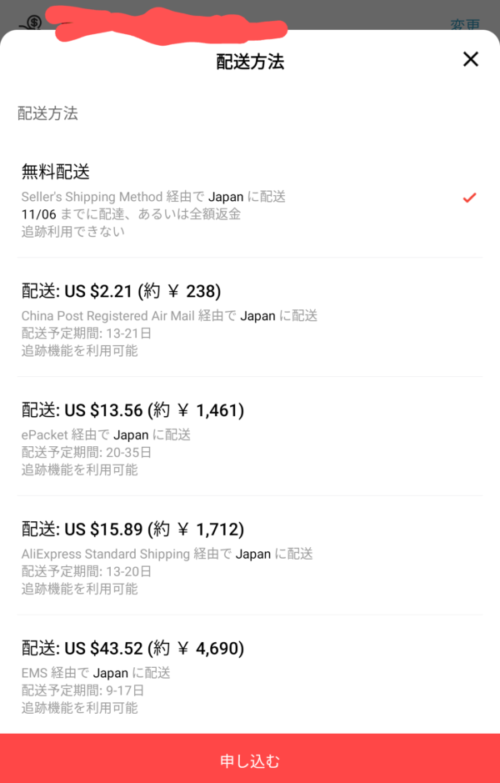 ということで私は追跡機能がある中で一番安いChina Post Registered Air Mailを使った。